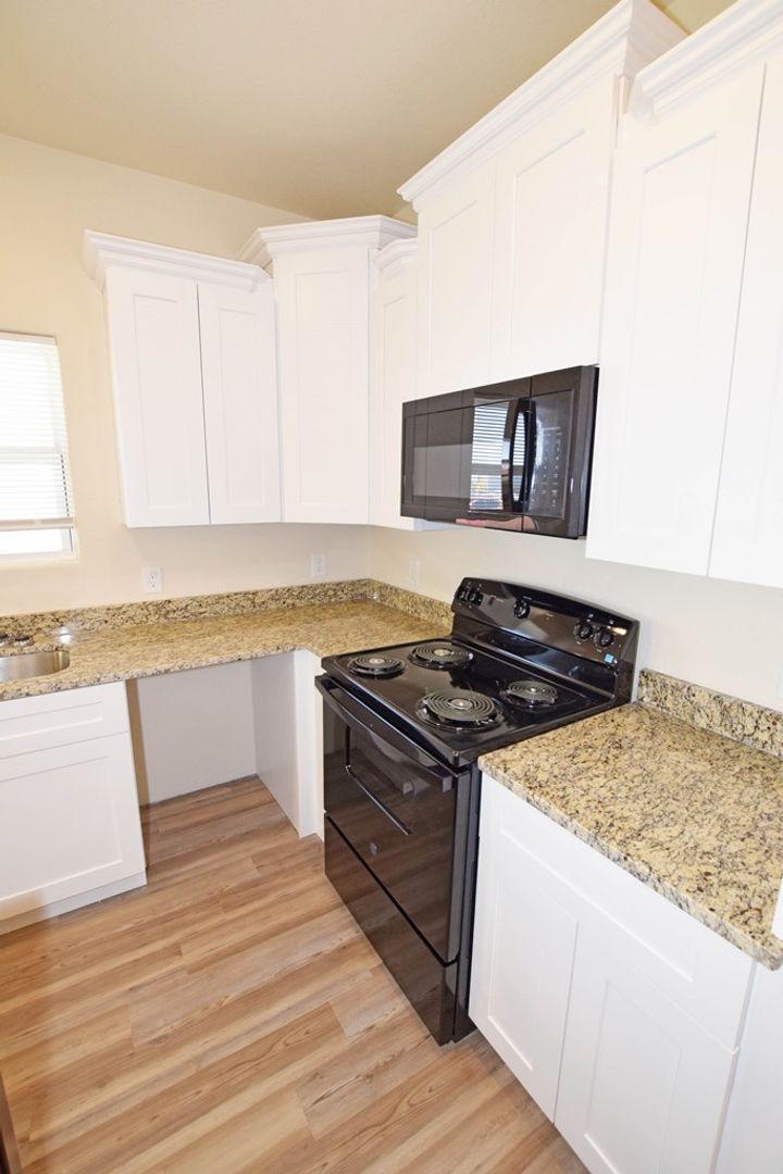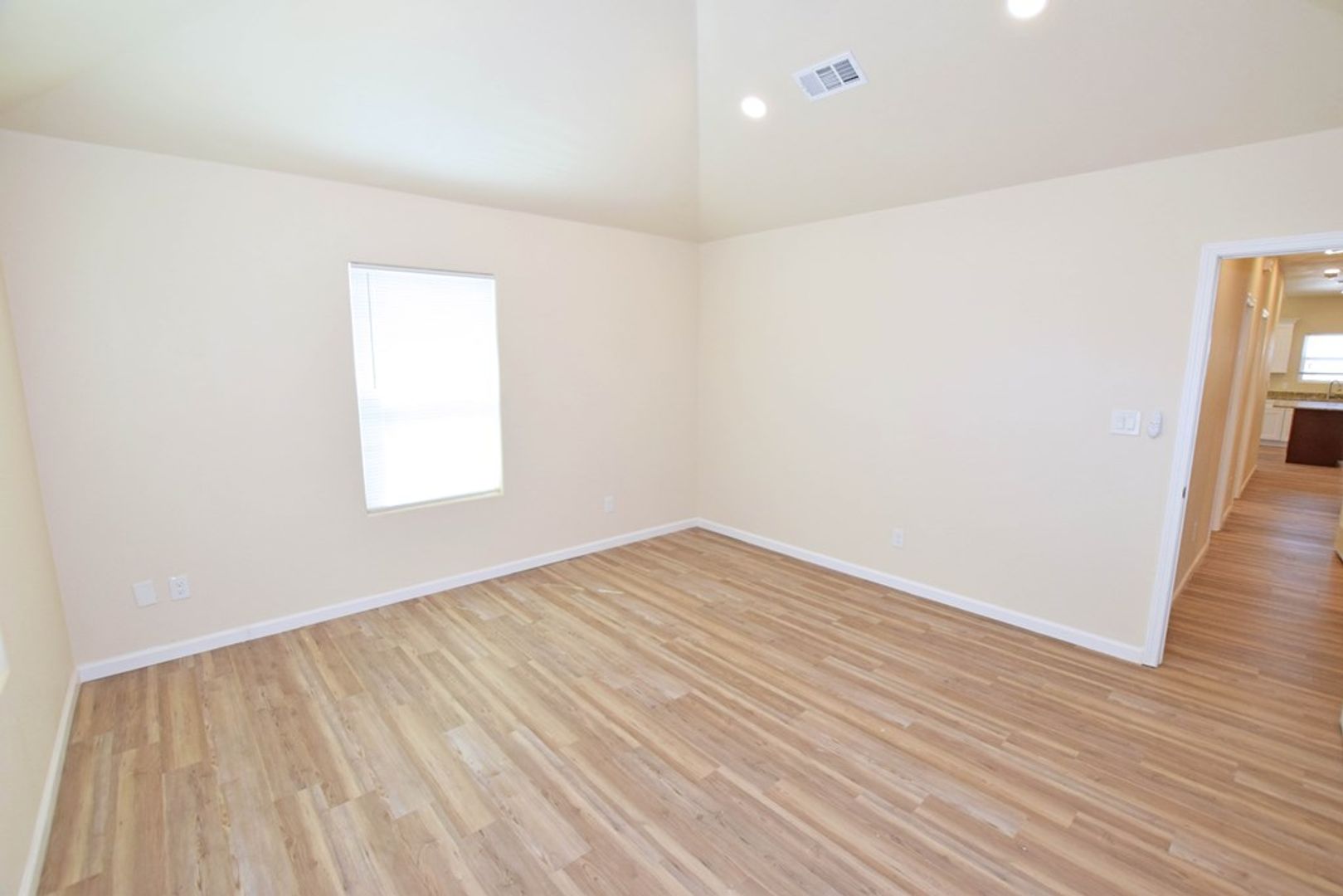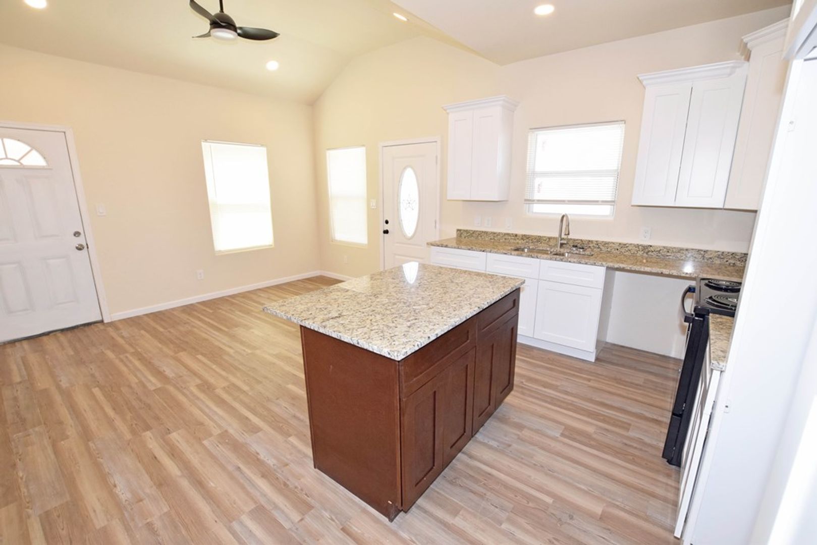 ABSOLUTELY NO CARPET, A MODERN DESIGN IN THIS OPEN-CONCEPT LIVING, BREAKFAST, AND KITCHEN WITH HIGH CEILINGS, CABINETRY. ABSOLUTELY NO WASTED SPACE, PERFECT SIZED YARD